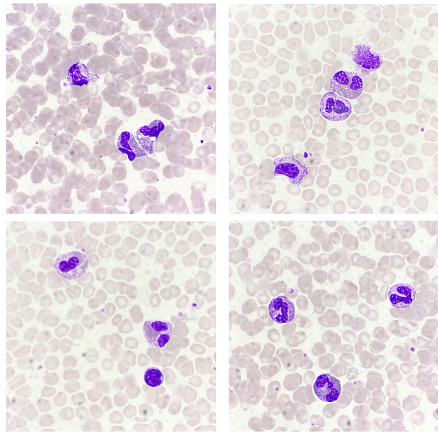 入院檢查雙耳前、耳后、頸前、頸后、腹股溝皆可扣及淋巴結(jié)腫大,質(zhì)軟,界清,易推動(dòng),部分融合。當(dāng)遇到這樣一份血液細(xì)胞形態(tài)(骨髓+外周血)送檢單時(shí),筆者首先想到的是—淋巴瘤。在鏡檢時(shí),淋巴細(xì)胞易見(jiàn),未見(jiàn)典型的淋巴瘤細(xì)胞,取而代之的是較多的嗜酸性粒細(xì)胞,見(jiàn)圖1~2: