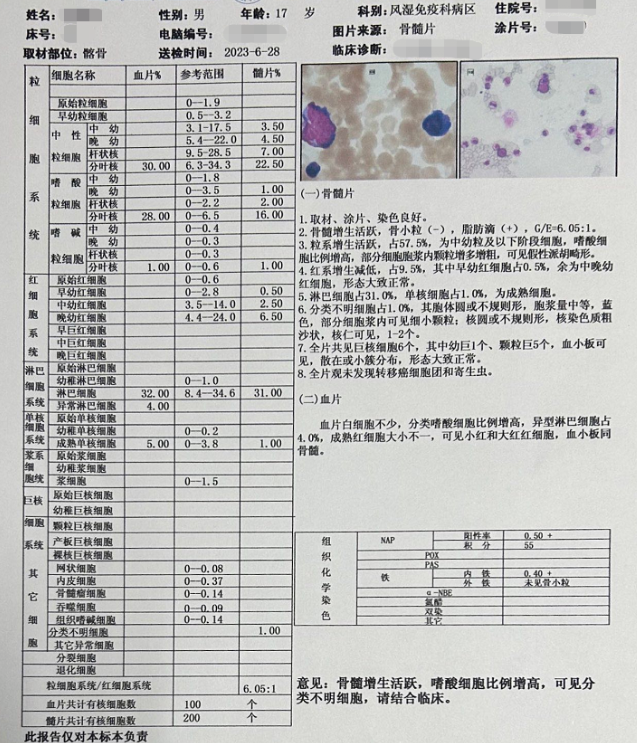血片意見(jiàn):白細(xì)胞不少,嗜酸性粒細(xì)胞增高,異型淋巴細(xì)胞4.0%,成熟紅細(xì)胞大小不一,可見(jiàn)小紅、大紅紅細(xì)胞,血小板同骨髓。