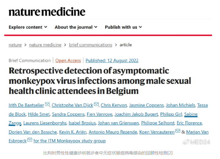2.De Baetselier I, Van Dijck C, Kenyon C, et al. Retrospective detection of asymptomatic monkeypox virus infections among male sexual health clinic attendees in Belgium. Nature medicine. 2022;28(11):2288-2292.